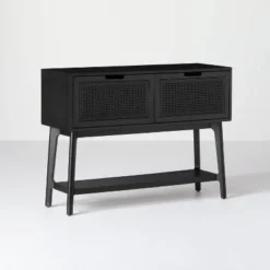 Enhance your dining room decor with this Grooved Wood with Glass 4-Door Sideboard Buffet Cabinet from Hearth & Hand™ with Magnolia. The natural brown buffet cabinet easily blends into any decor scheme and has two sets of double windowpane glass doors that open to reveal two storage shelves on each side. With a grooved design and cable management cutout at the back, this cabinet is great for accommodating dishes, cutlery, tableware and media items. Plus, the smooth top surface can be used for appetizer trays and a table lamp.